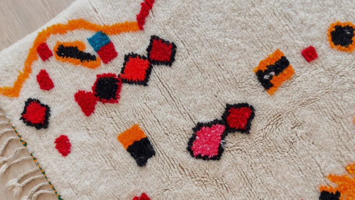 Ce tapis Azilal semble murmurer plutôt que parler. Les motifs géométriques apparaissent comme des fragments, entourés de petites touches colorées, presque comme des pensées éparses déposées sur la laine naturelle. Chaque détail est tissé à la main, sans contrainte ni répétition stricte. Le tapis... -