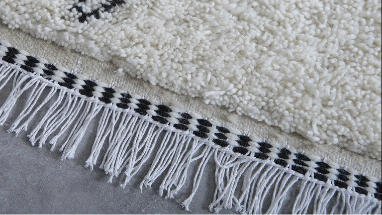 Ce tapis marocain Beni Ourain fait main séduit par la force maîtrisée de ses lignes géométriques. Les motifs noirs, tracés à la main sur une laine naturelle claire, créent un contraste élégant qui met en valeur la structure du dessin sans jamais l’alourdir. ... -