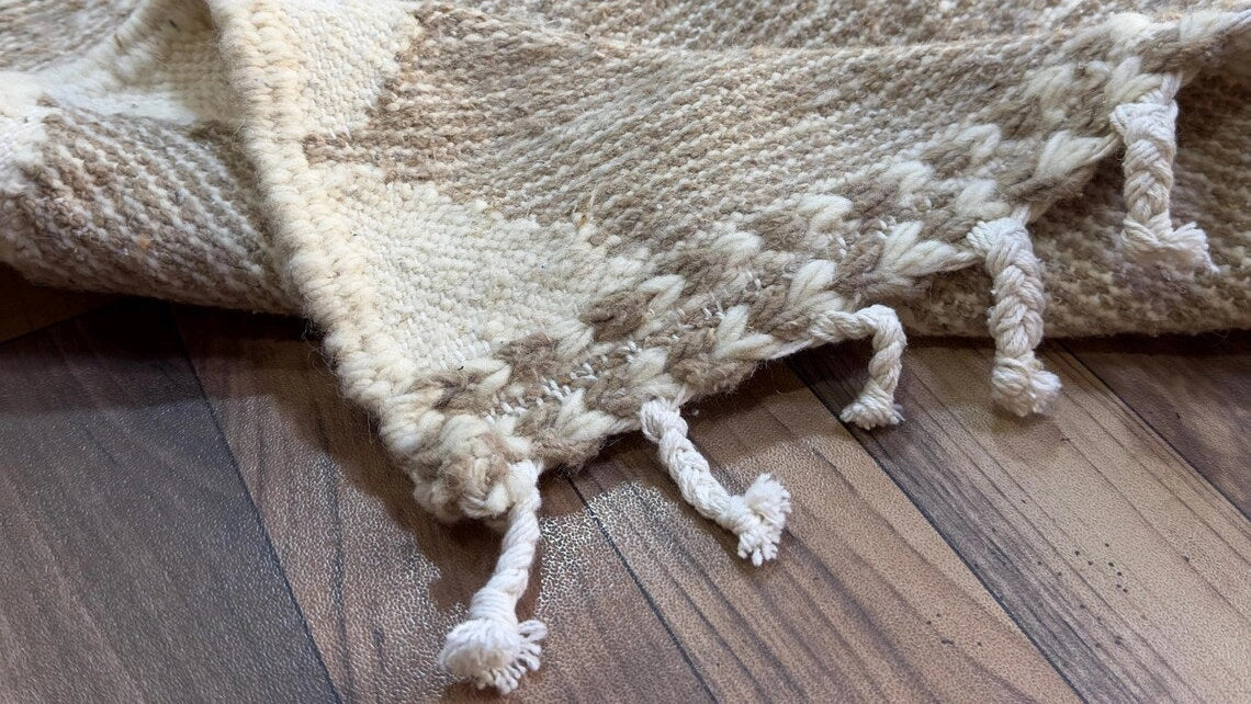 D’une grande sobriété, ce tapis Zanafi se distingue par l’absence volontaire de motifs apparents. La trame devient ici le sujet principal, révélant la beauté du geste artisanal dans sa forme la plus pure. Entièrement tissé à la main en laine naturelle, ce tapis marocain...