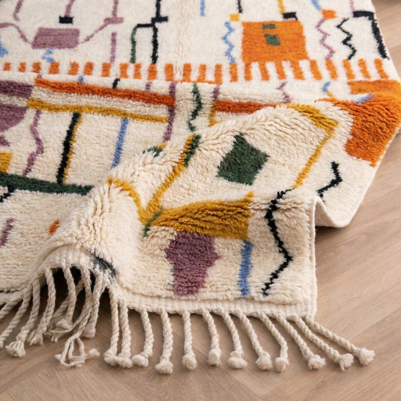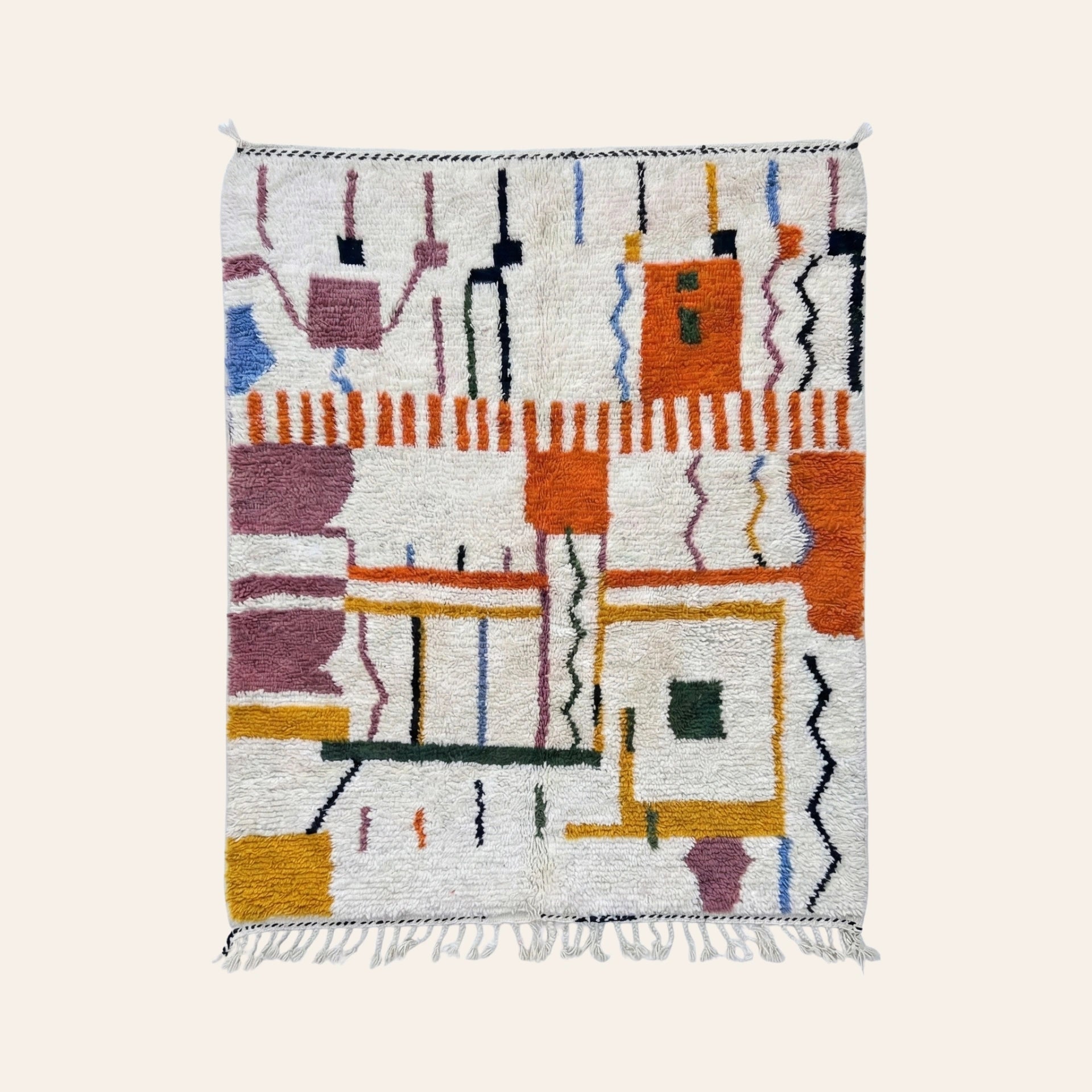 Tapis Azilal tissé à la main dans le Haut Atlas marocain, mêlant laine naturelle et motifs libres aux couleurs vibrantes. Chaque pièce est une expression artistique unique, apportant caractère, énergie et authenticité à votre intérieur.