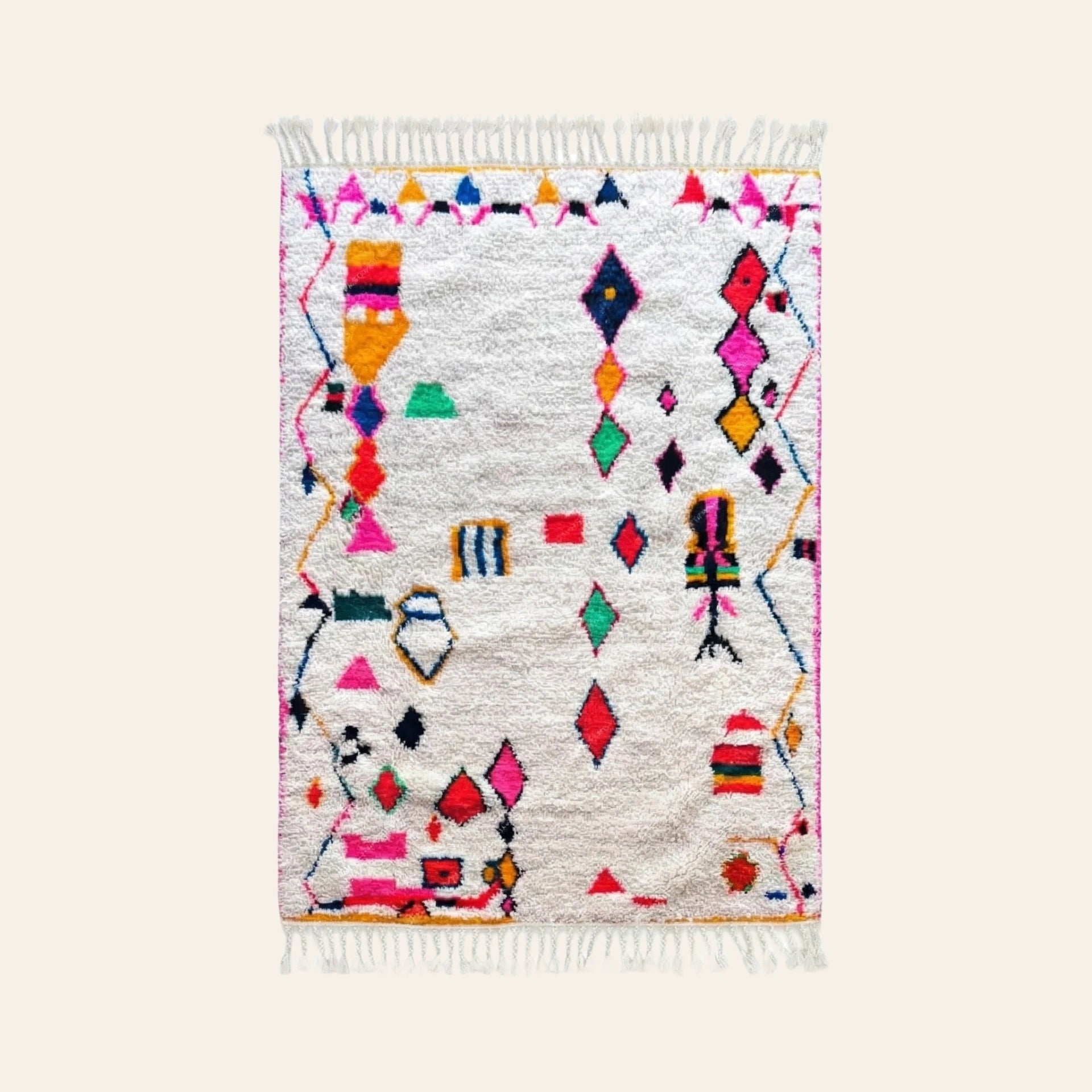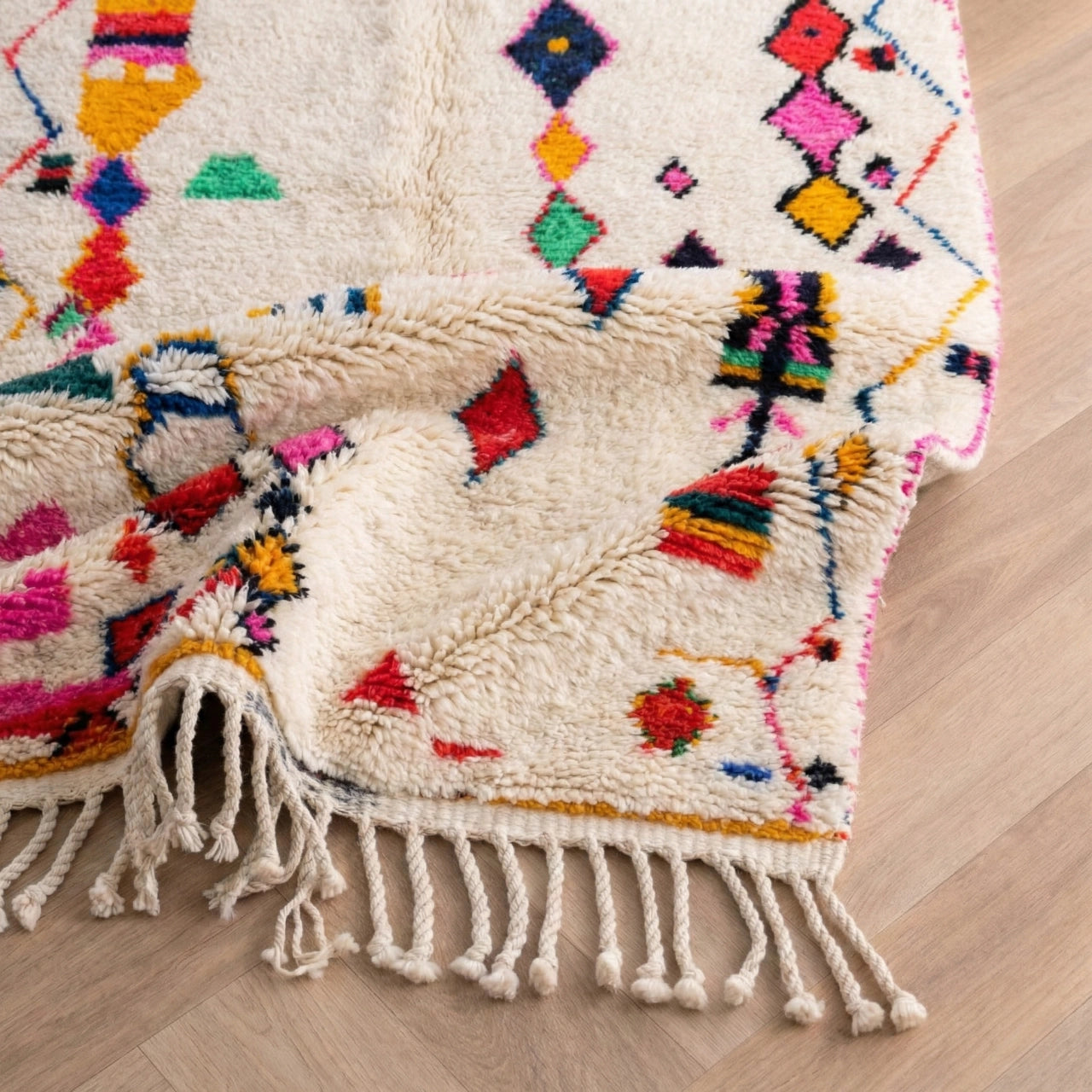 Tapis Azilal tissé à la main dans le Haut Atlas marocain, mêlant laine naturelle et motifs libres aux couleurs vibrantes. Chaque pièce est une expression artistique unique, apportant caractère, énergie et authenticité à votre intérieur.