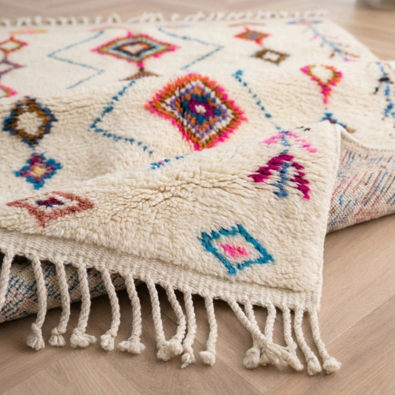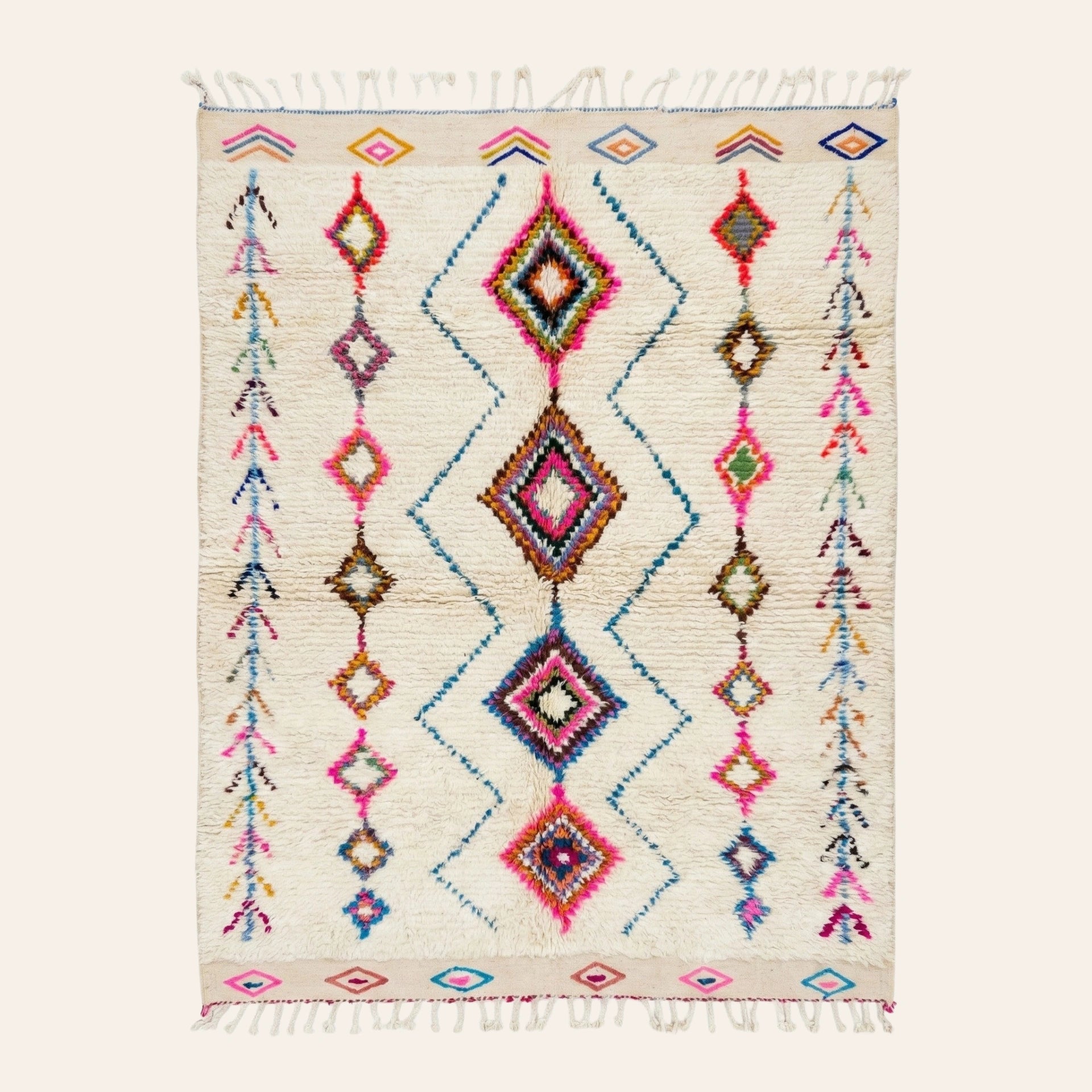Tapis Azilal tissé à la main dans le Haut Atlas marocain, mêlant laine naturelle et motifs libres aux couleurs vibrantes. Chaque pièce est une expression artistique unique, apportant caractère, énergie et authenticité à votre intérieur.