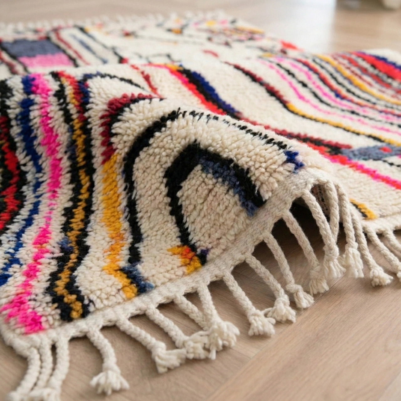 Tapis Azilal tissé à la main dans le Haut Atlas marocain, mêlant laine naturelle et motifs libres aux couleurs vibrantes. Chaque pièce est une expression artistique unique, apportant caractère, énergie et authenticité à votre intérieur.