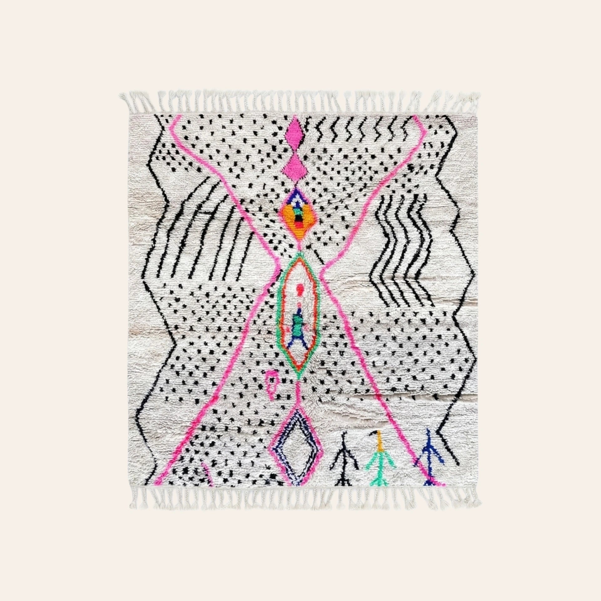 Le tapis marocain Azilal est souvent comparé à un journal intime. Ici, les motifs évoquent le passage, le choix, la transition. Rien n’est figé. Les points, les lignes ondulantes et les touches de couleur racontent un instant suspendu, un moment de transformation.