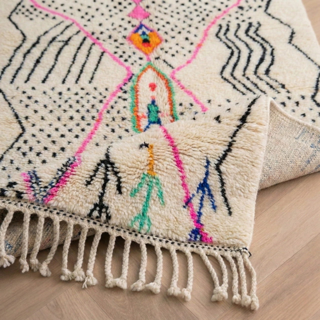 Tapis Azilal tissé à la main dans le Haut Atlas marocain, mêlant laine naturelle et motifs libres aux couleurs vibrantes. Chaque pièce est une expression artistique unique, apportant caractère, énergie et authenticité à votre intérieur.