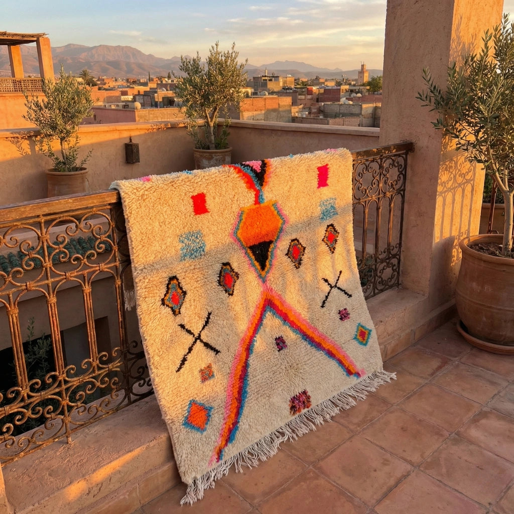 Tapis Azilal tissé à la main dans le Haut Atlas marocain, mêlant laine naturelle et motifs libres aux couleurs vibrantes. Chaque pièce est une expression artistique unique, apportant caractère, énergie et authenticité à votre intérieur.
