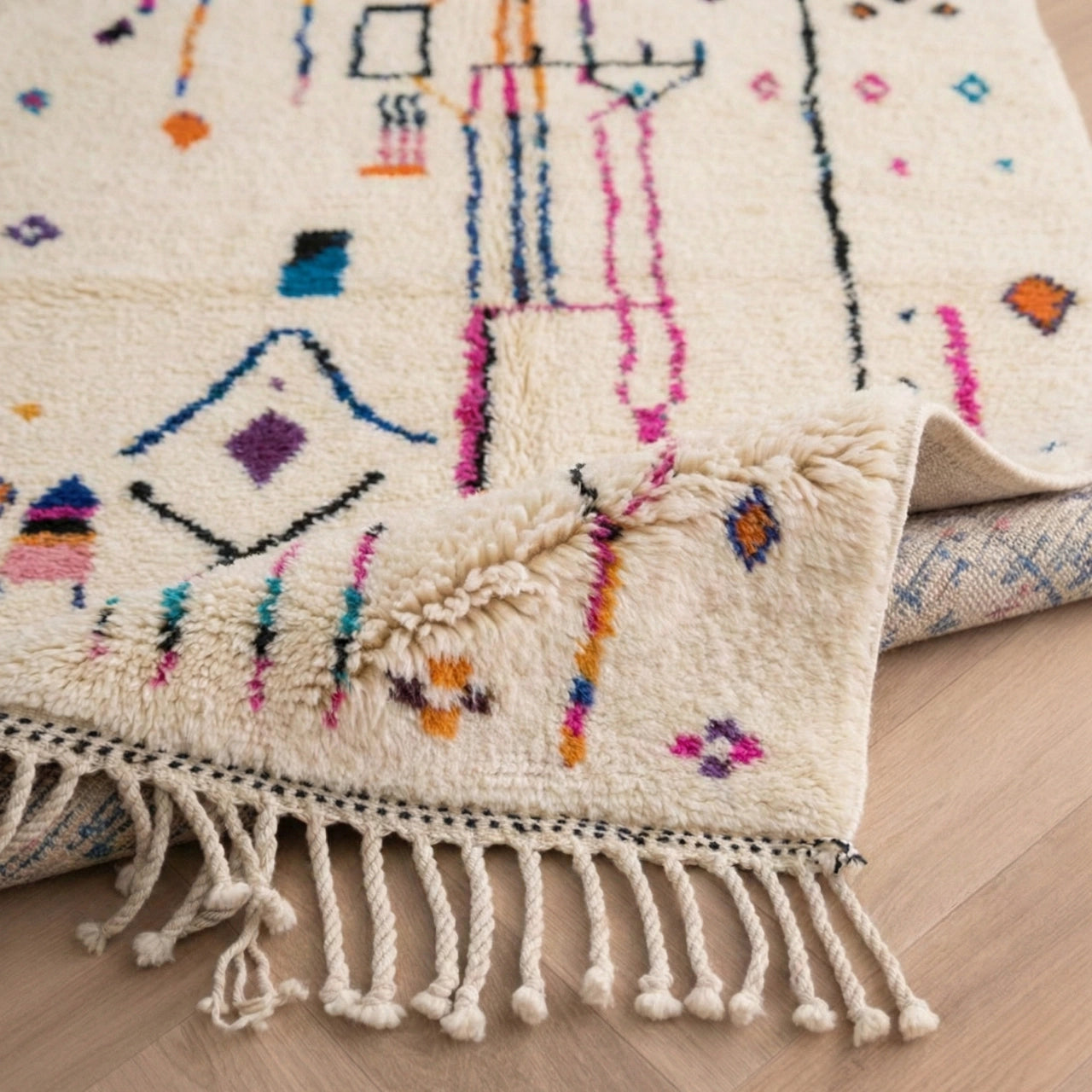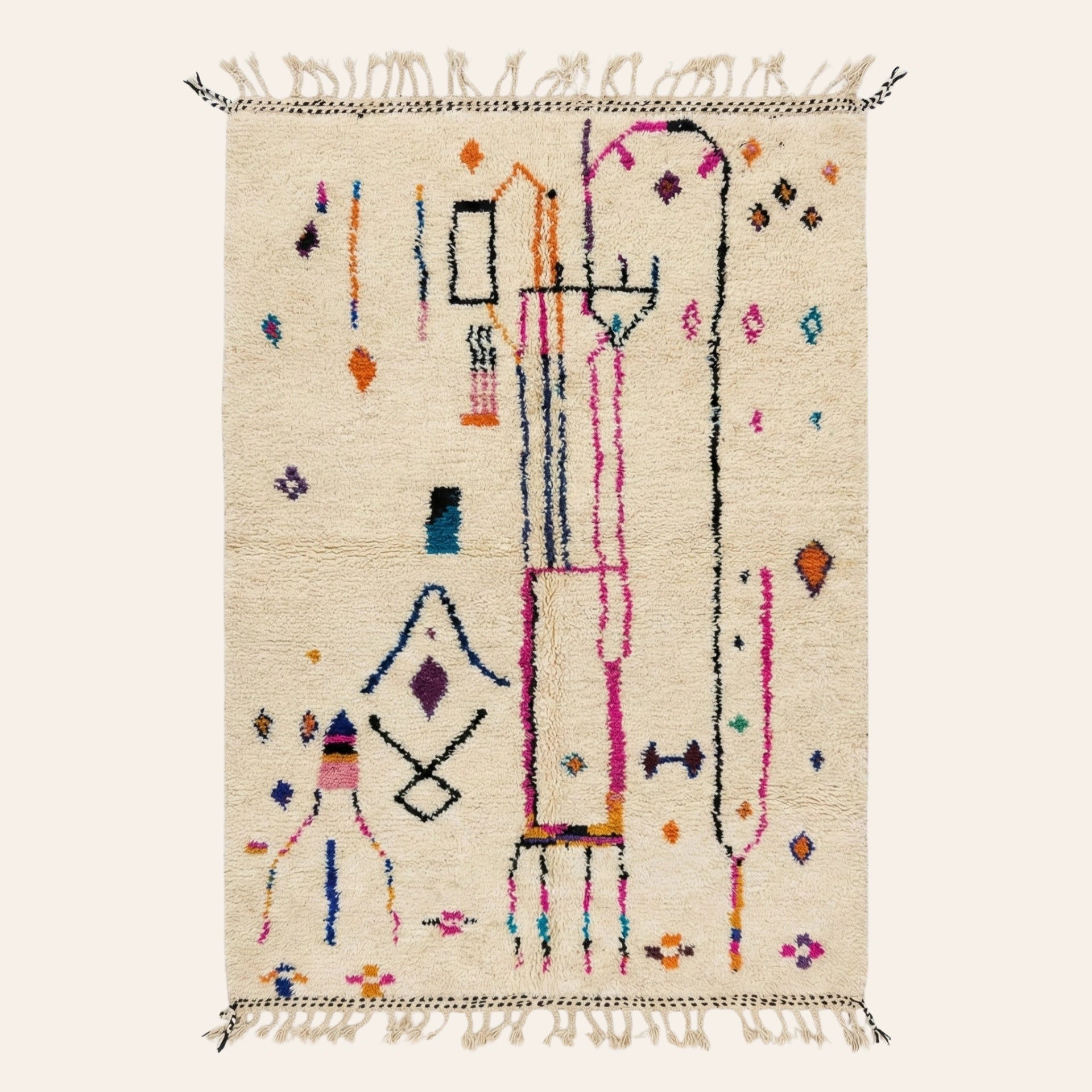 Tapis Azilal tissé à la main dans le Haut Atlas marocain, mêlant laine naturelle et motifs libres aux couleurs vibrantes. Chaque pièce est une expression artistique unique, apportant caractère, énergie et authenticité à votre intérieur.