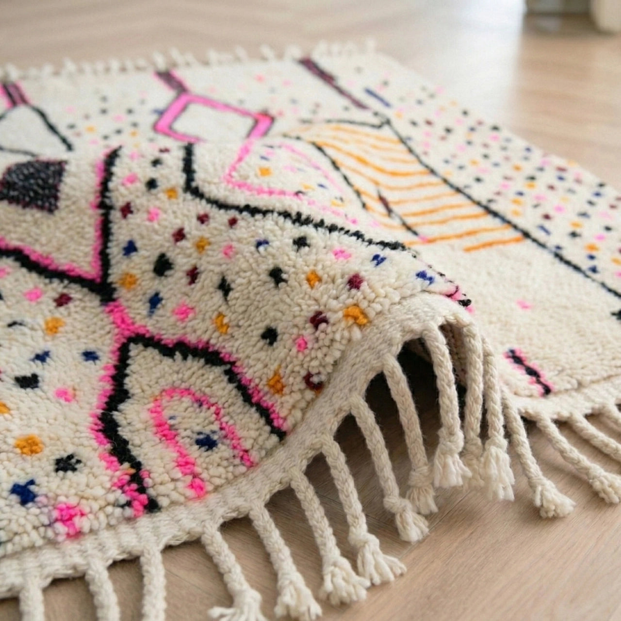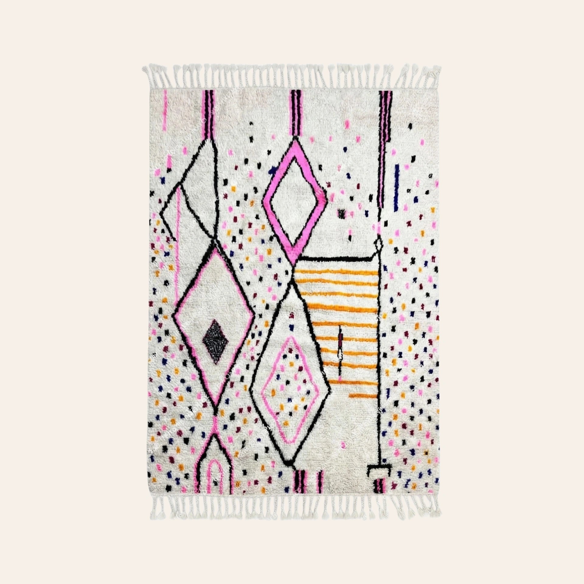 Tapis Azilal tissé à la main dans le Haut Atlas marocain, mêlant laine naturelle et motifs libres aux couleurs vibrantes. Chaque pièce est une expression artistique unique, apportant caractère, énergie et authenticité à votre intérieur.