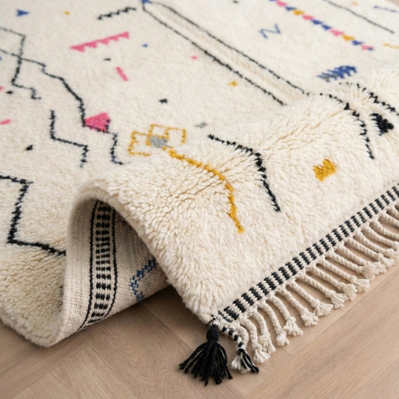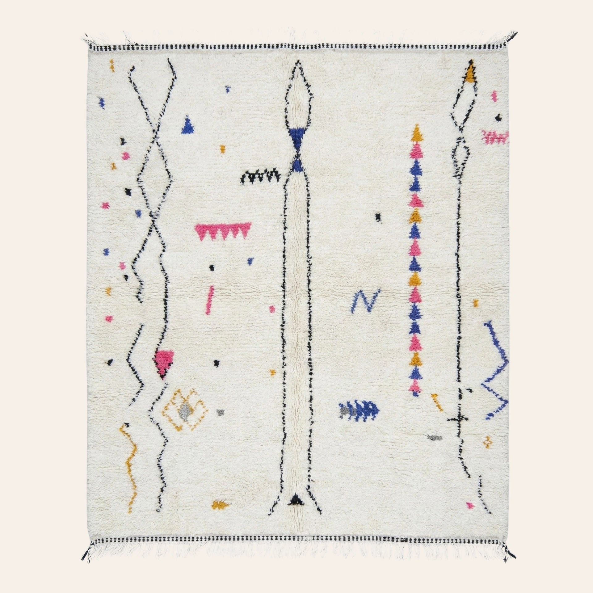 Tapis Azilal tissé à la main dans le Haut Atlas marocain, mêlant laine naturelle et motifs libres aux couleurs vibrantes. Chaque pièce est une expression artistique unique, apportant caractère, énergie et authenticité à votre intérieur.