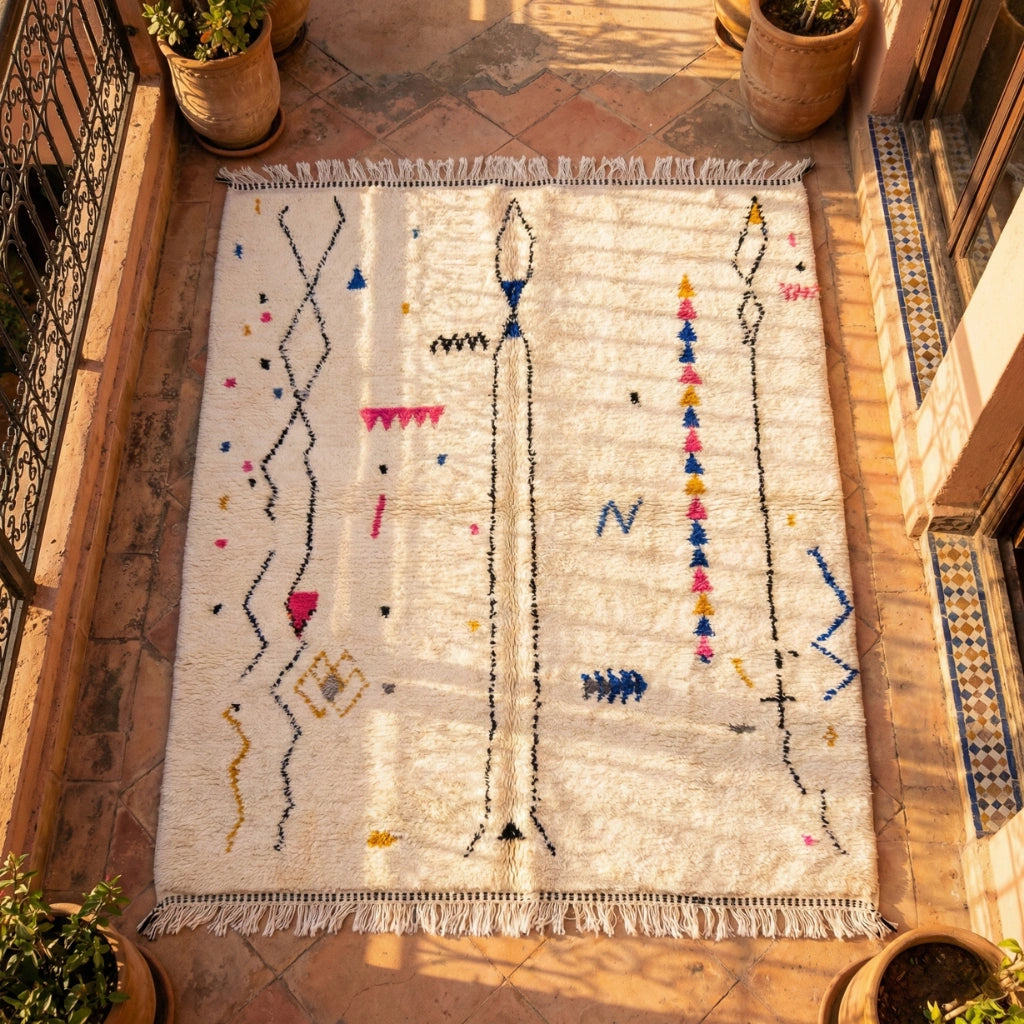 Sélectionné par Rug Riad, ce tapis fait main est idéal pour des intérieurs épurés, contemporains ou poétiques. Un tapis en laine naturelle qui crée une atmosphère calme et profonde, presque méditative, tout en conservant l’authenticité de l’artisanat marocain.