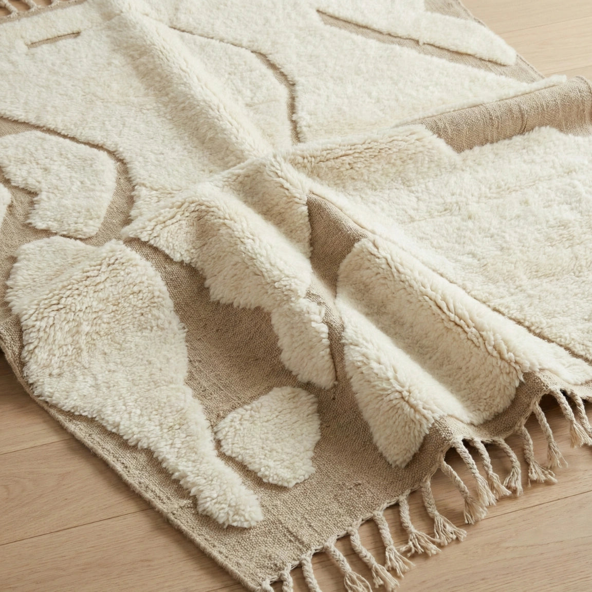 Ce tapis marocain Mrirt fait main s’inspire des formes minérales et des reliefs naturels. Tissé à la main en laine naturelle dense, il associe des tons sable et ivoire à des motifs abstraits sculptés dans la matière, révélant toute la finesse du tissage Mrirt.