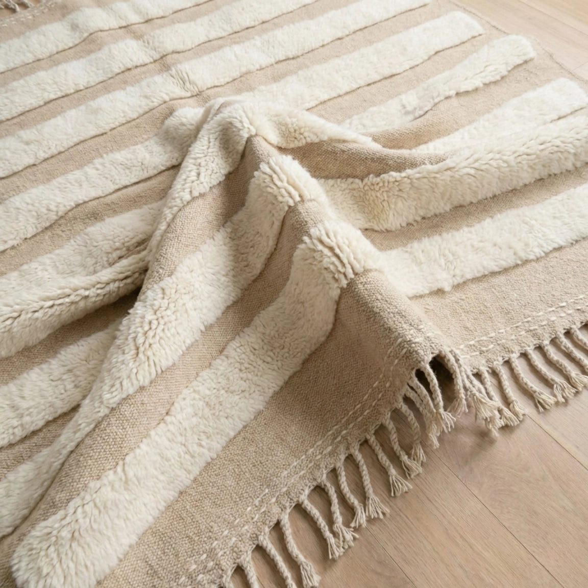 Tapis Mrirt d’exception, tissé à la main avec une laine dense et soyeuse provenant du Moyen Atlas marocain. Reconnu pour sa finesse, son confort incomparable et son élégance intemporelle, il incarne le luxe discret du tapis marocain authentique.